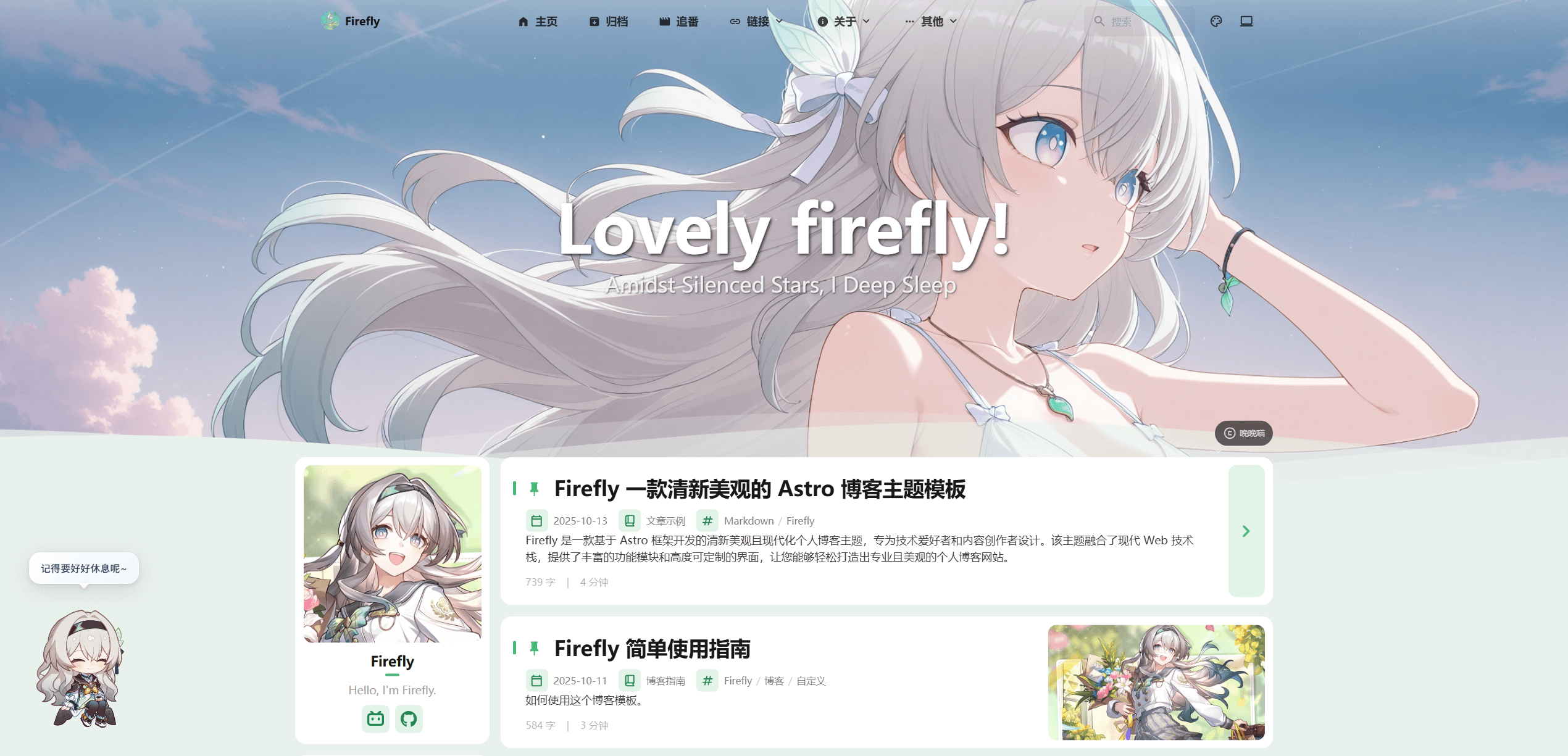 Firefly 是一款基于 Astro 框架开发的清新美观且现代化个人博客主题,专为技术爱好者和内容创作者设计。该主题融合了现代 Web 技术栈,提供了丰富的功能模块和高度可定制的界面,让您能够轻松打造出专业且美观的个人博客网站。